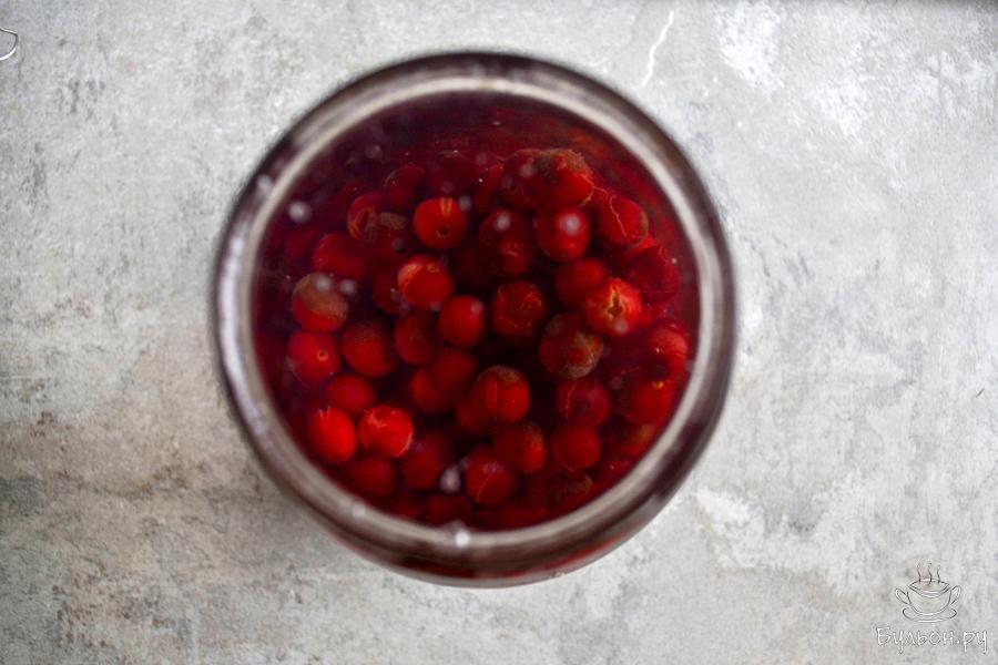 2. Банку промойте горячей водой с содой, ошпарьте кипятком. Крышку промойте и прокипятите 2-3 минуты. Засыпьте вишню в банку.