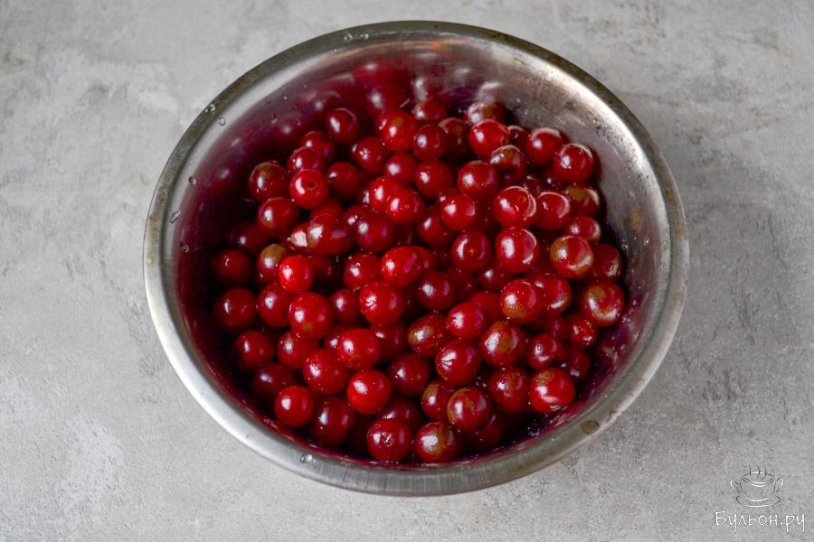 1. Переберите вишню. Все подпорченные ягодки выбросьте. Промойте вишню в нескольких водах, чтобы избавиться от растительного мусора и загрязнений.