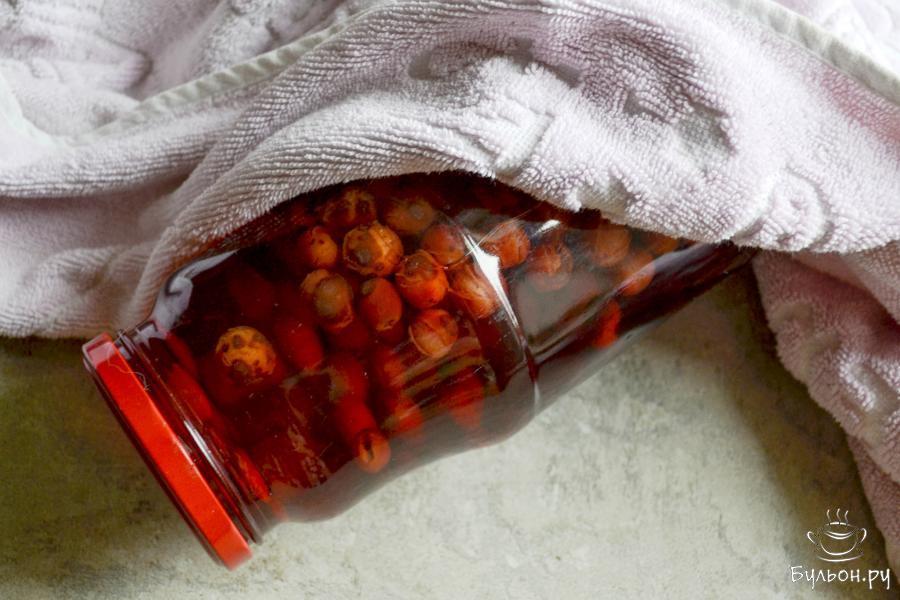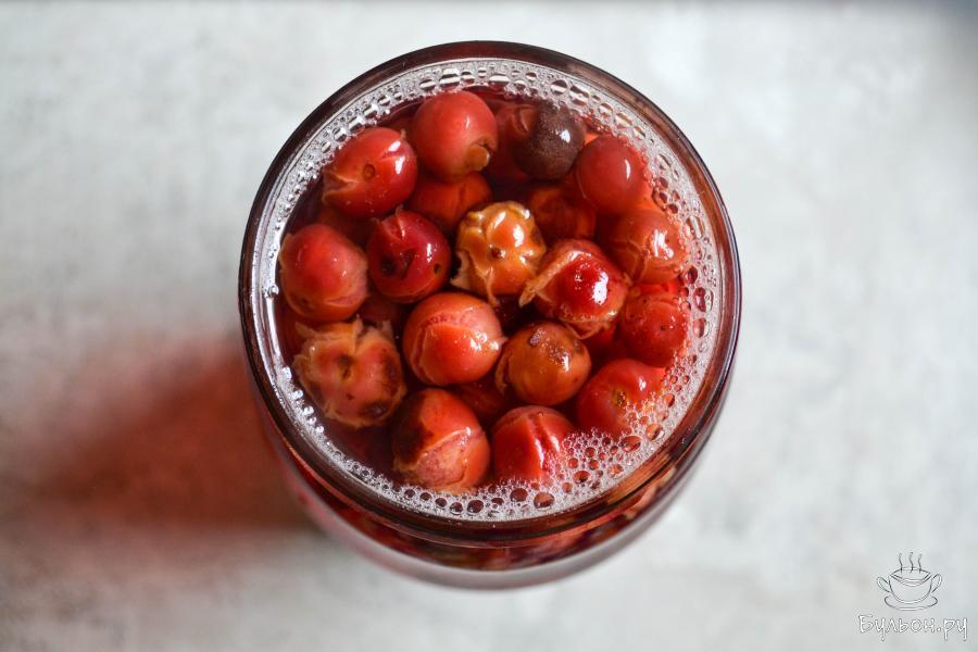 3. Вскипятите воду и залейте ее в банку до самого верха, слегка закрутите банку крышкой и оставьте на полчаса, чтобы вишня как следует прогрелась.