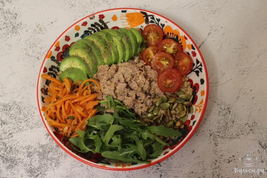 5. Поверх выложите кусочки тунца, половинки черри, нарезанный авокадо, морковь по-корейски, тыквенные семечки, рукколу. На авокадо и рукколу полейте оливковое масло. Авокадо подсолите и немного поперчите.