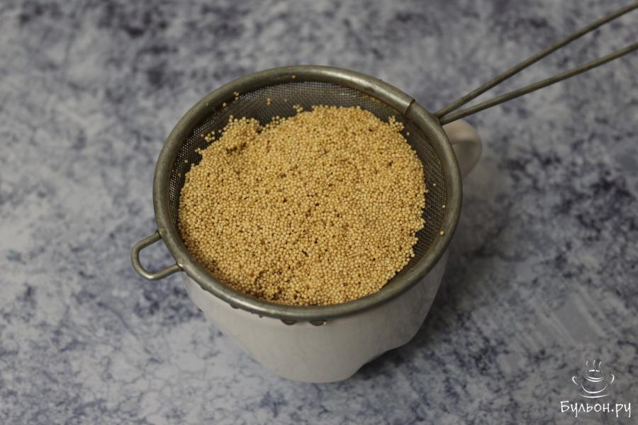 2. Зерна амаранта очень мелкие, поэтому пересыпьте их в мелкое сито и промойте под струей воды. Оставьте амарант в сите, чтобы стекла лишняя вода. Промыть зерна другим способом проблематично, так как амарант всплывает на поверхности воды. Тогда лучше воспользуйтесь марлечкой, сливая воду с миски.