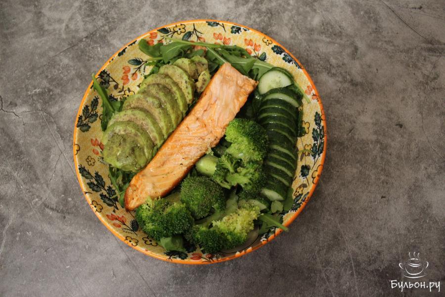 5. На тарелки выложите вымытую рукколу. В центре расположите по половине стейка лосося. По бокам выложите брокколи, огурец и авокадо. Слегка подсолите и поперчите овощи, полейте оливковым маслом и подайте на стол.
