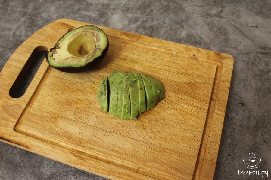 3. Разрежьте плод авокадо и удалите косточку. При помощи ложки достаньте мякоть авокадо и нарежьте ломтиками.