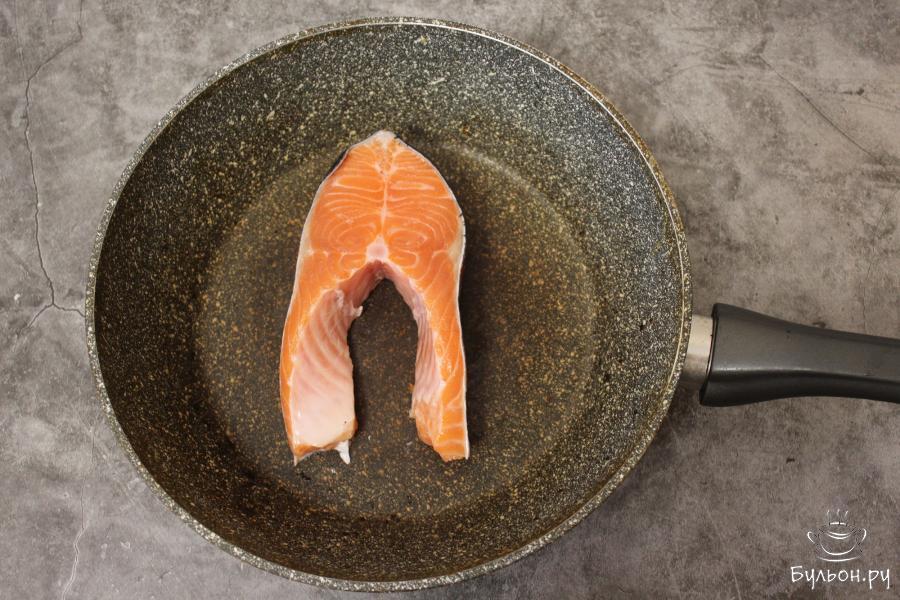 1. Лосось промойте, промокните бумажными полотенцами, слегка подсолите и обжарьте на сковороде. Если рыба жирная, масло добавлять не надо. Если же жира хватать не будет, добавьте немного оливкового масла.