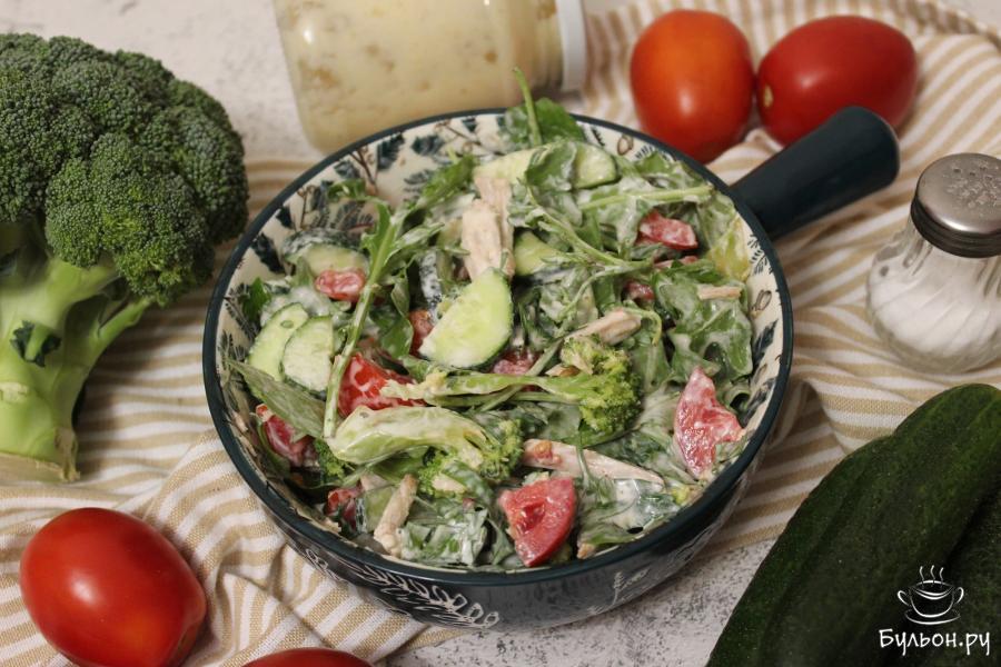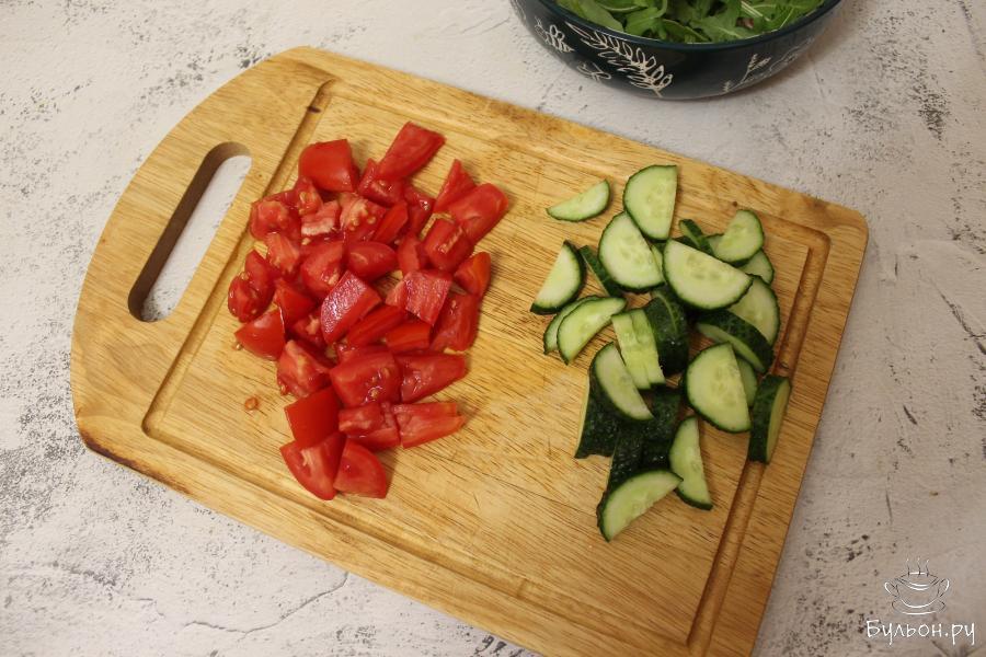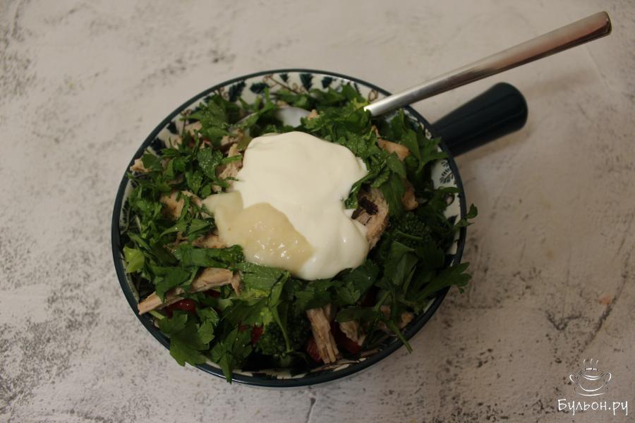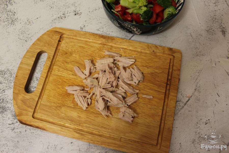3. В кипящей, чуть подсоленной воде, в течение 2 минут, отварите соцветия брокколи. Затем слейте воду, а сами соцветия нарежьте поменьше и переложите в салатник.