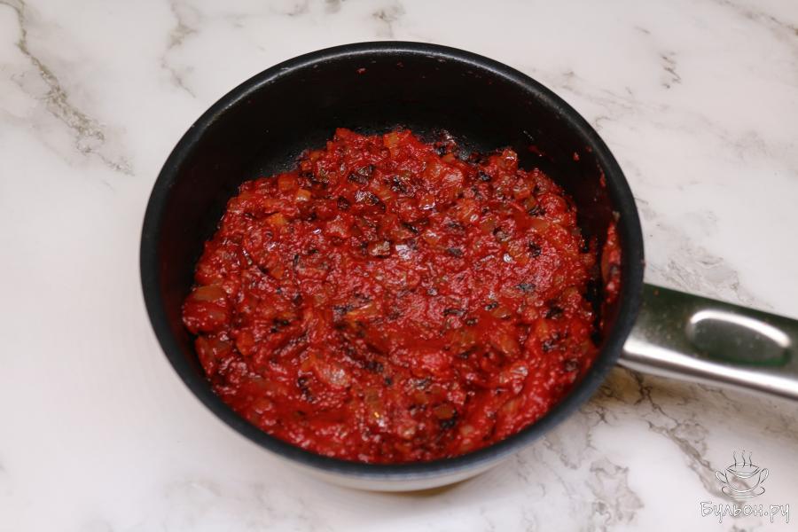 3. На сковороде пассируйте в растительном масле мелко нарезанный лук, затем добавьте томатную пасту и еще немного поджарьте все вместе.