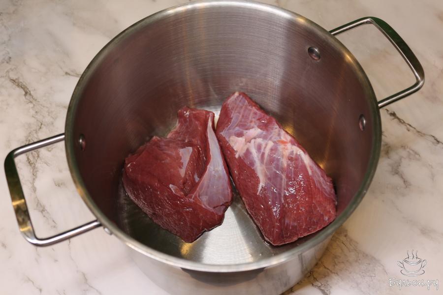 1. Возьмите пятилитровую кастрюлю, положите говядину, залейте водой и поставьте кастрюлю на огонь. Когда бульон начнет закипать, сделайте пламя поменьше и снимите пенку. Затем готовьте бульон на маленьком огне примерно 1 час.