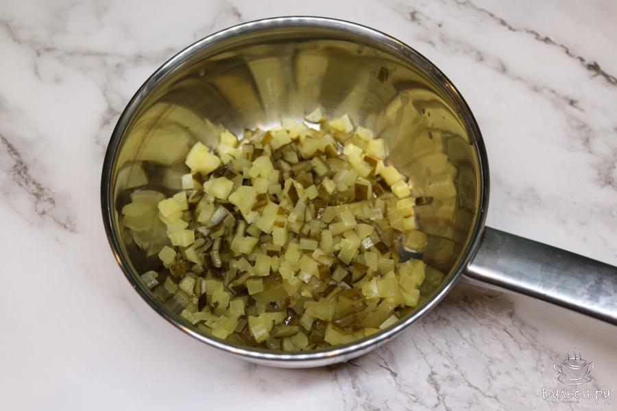 2. Соленые огурцы нарежьте кубиками, выложите их в маленькую кастрюльку и тушите в небольшом количестве воды.