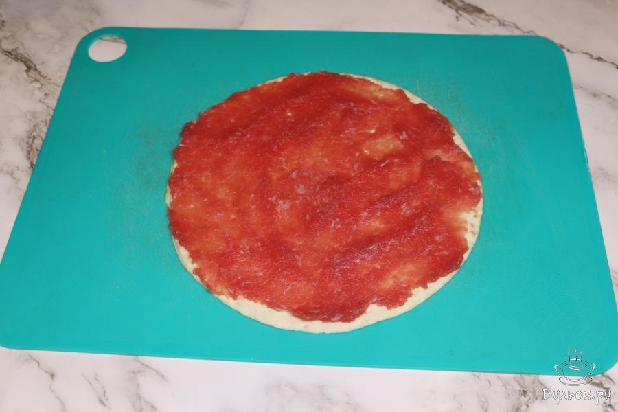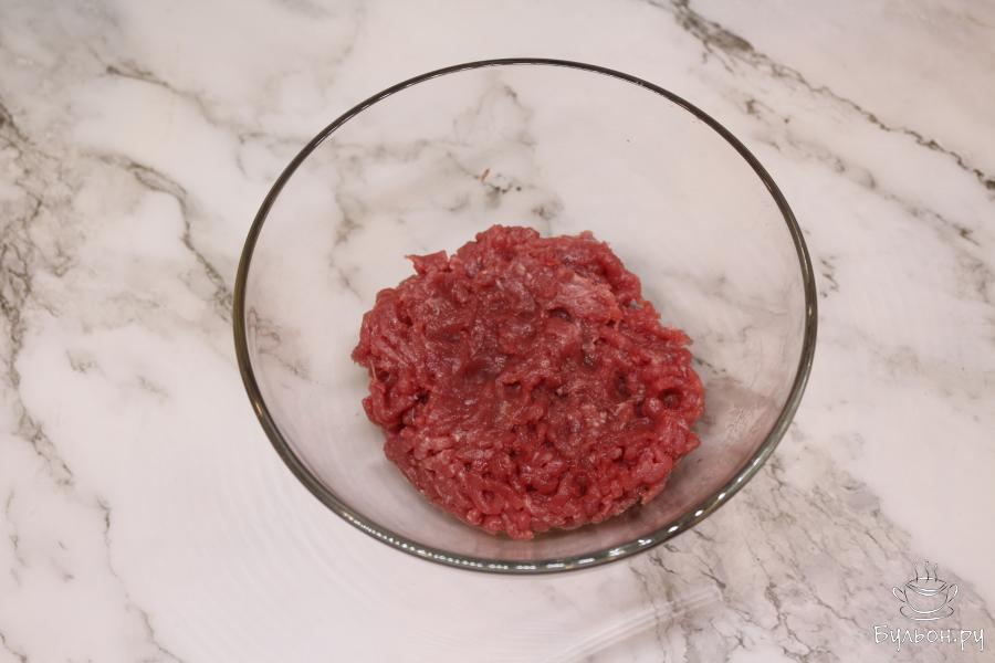 2. Возьмите тортилью и прямо на нее, тонким слоем, размажьте фарш. В сковороду влейте масло, поставьте на огонь. Затем фаршем вниз положите тортилью на сковороду и обжарьте так ее 4 минуты.