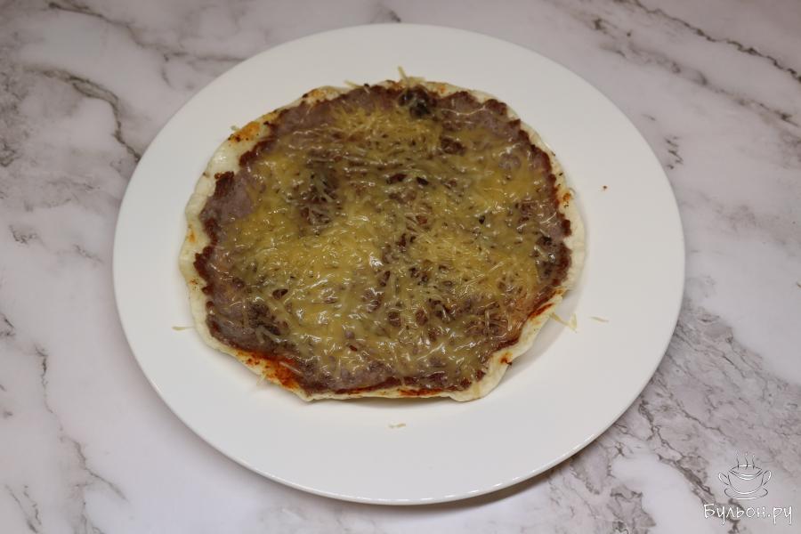 3. Затем положите тортилью на тарелку. На фарш выложите натертый сыр, накройте крышкой, чтобы сыр подплавился.