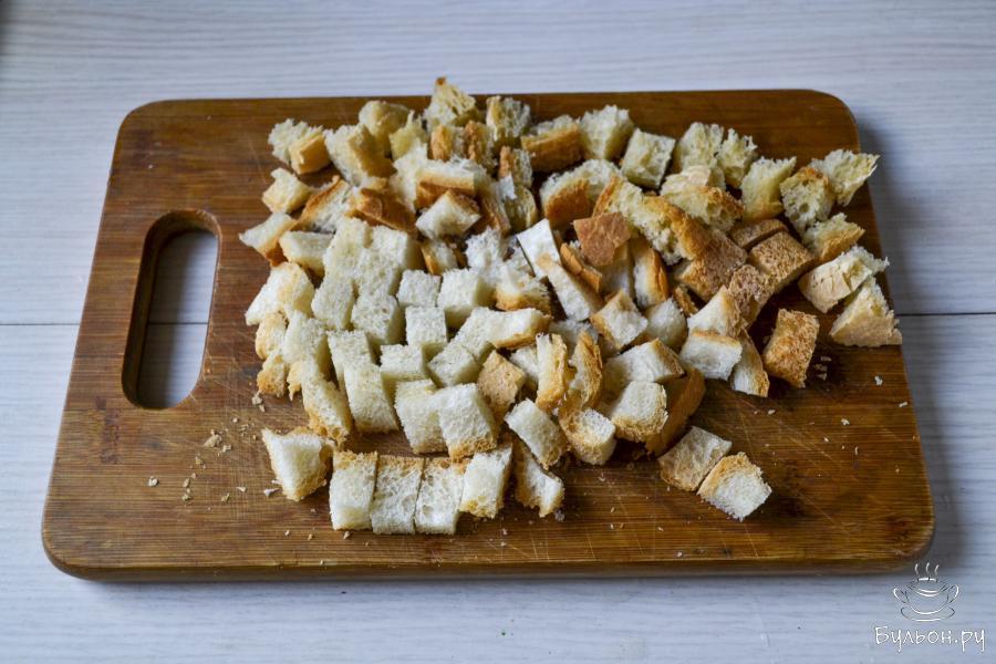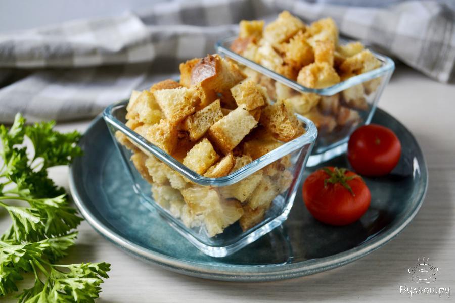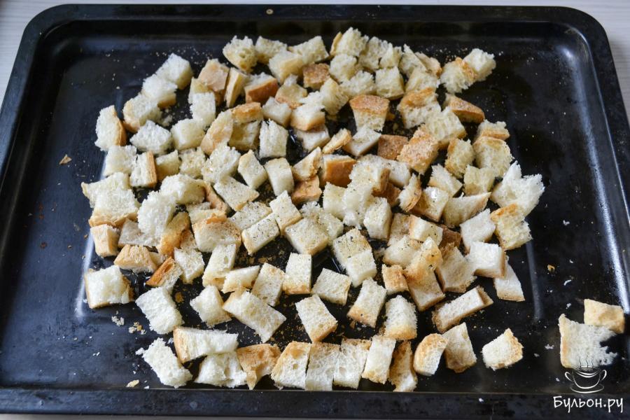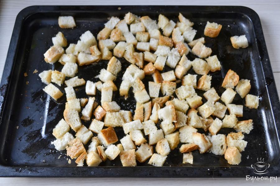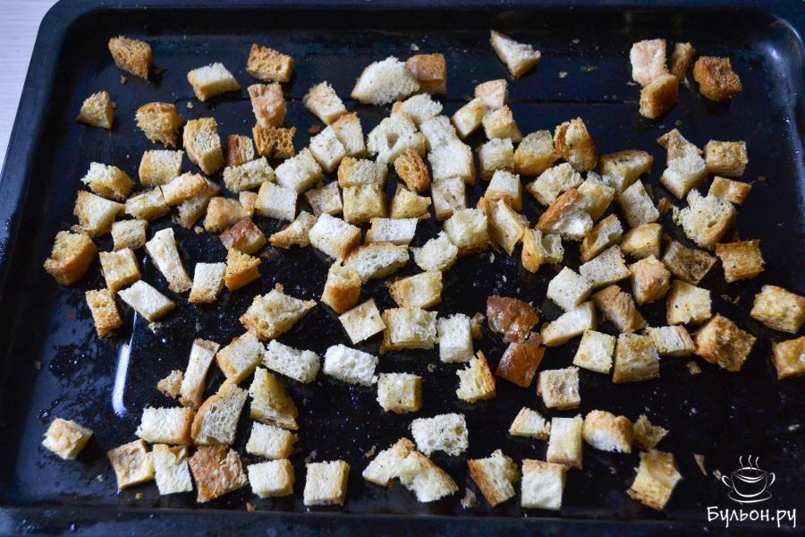 4. Поставьте противень в духовку, предварительно разогретую до 200С, на средний уровень. Запекайте примерно 10-15 минут. Во время запекания переверните сухарики, чтобы равномерно покрылись румяной корочкой.