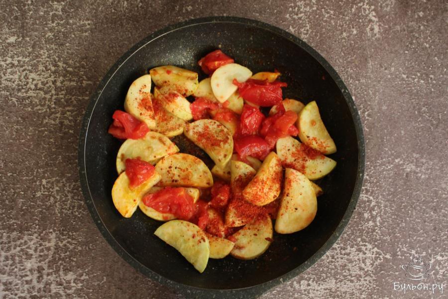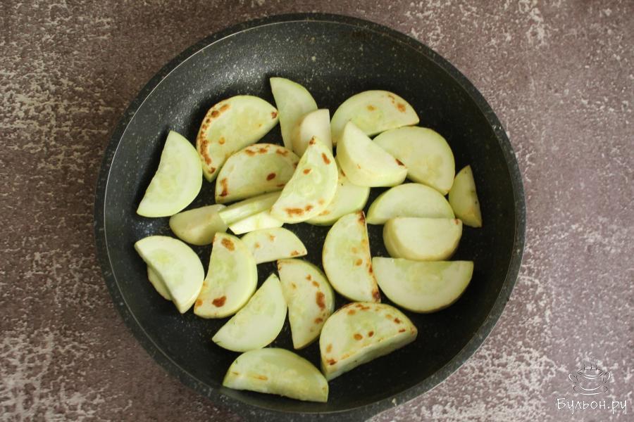 1. Маленький кабачок промыть, обсушить, нарезать не сильно тонкими полукружочками. На сковороде разогреть масло и обжарить кабачки до легкой румяности со всех сторон.