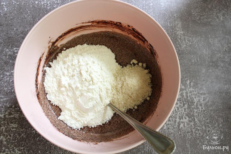 5. Добавить в чашку оба вида муки и снова перемешать. Миндальную муку можно заменить на миндальную крошку.