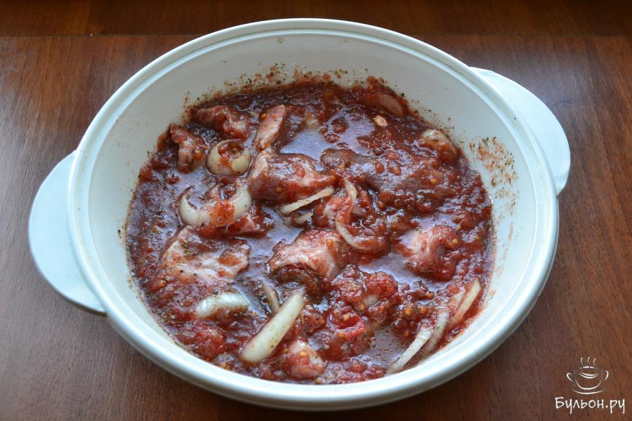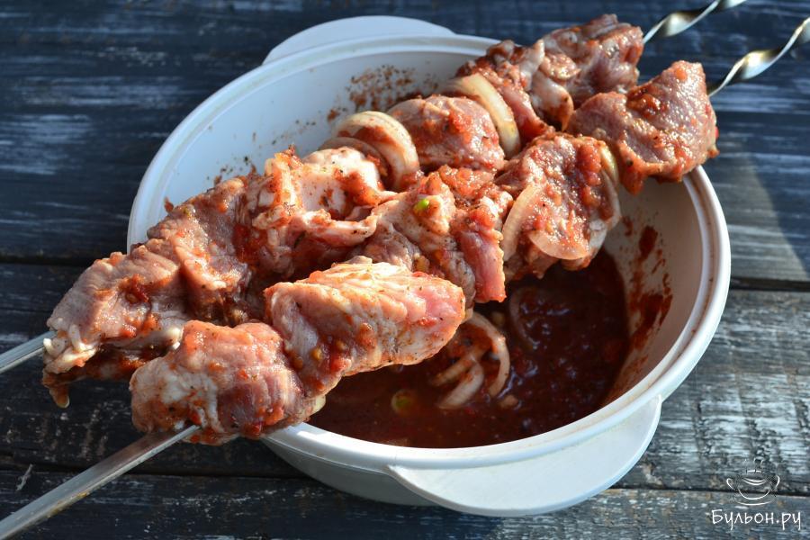 Хочу предложить вам один из самых любимых рецептов шашлыка в моей семье - в томатном маринаде. Рецепт довольно прост, а в итоге получается необычайно сочное и ароматное мясо. Есть несколько советов по приготовлению вкуснейшего шашлыка в томатном маринаде: солится мясо минут за 10 до жарки, шампуры нужно часто переворачивать - маринованная свинина быстро зарумянивается. Готовить такой шашлык можно и на костре, и в духовке - вкусно будет в любом случае. Советую.