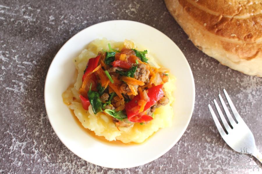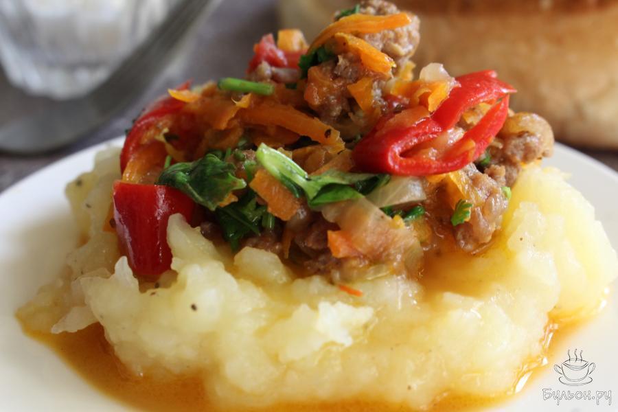 Когда хочется простой и вкусный обед, всегда можно приготовить пюре с подливой из мясного фарша и овощей. Готовится блюдо просто и достаточно быстро. Пюре с подливкой получается яркое, сытное, ароматное и аппетитное. Мясной фарш для приготовления подливы используйте тот, который вы любите. Если вы хотите густую подливку, то добавляйте меньше воды. Если вы привыкли добавлять в пюре сливочное масло, то можно, дополнительно, добавить его, хотя подливка достаточно насыщенная и можно обойтись без добавок в пюре.