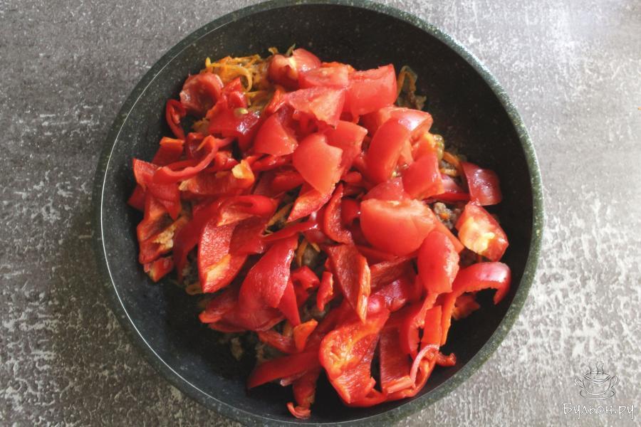 6. Красные сладкие перцы нарезать крупными полосками, помидоры дольками. Выложить их на сковороду, жарить 5-8 минут.