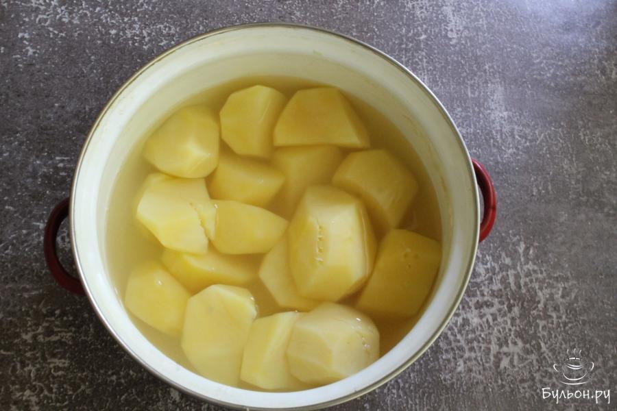 1. Овощи почистить, промыть. Картошку нарезать крупно, выложить в кастрюлю. Влить 2.5 л. воды и добавить 1 ч. л. соли. Варить картошку 20-25 минут.