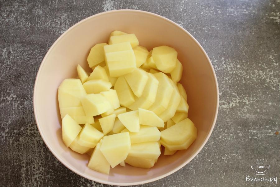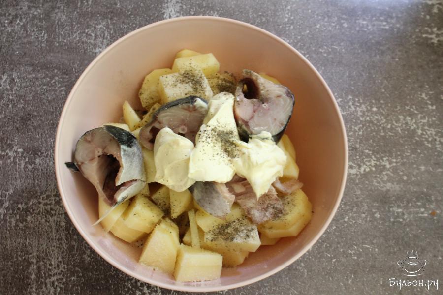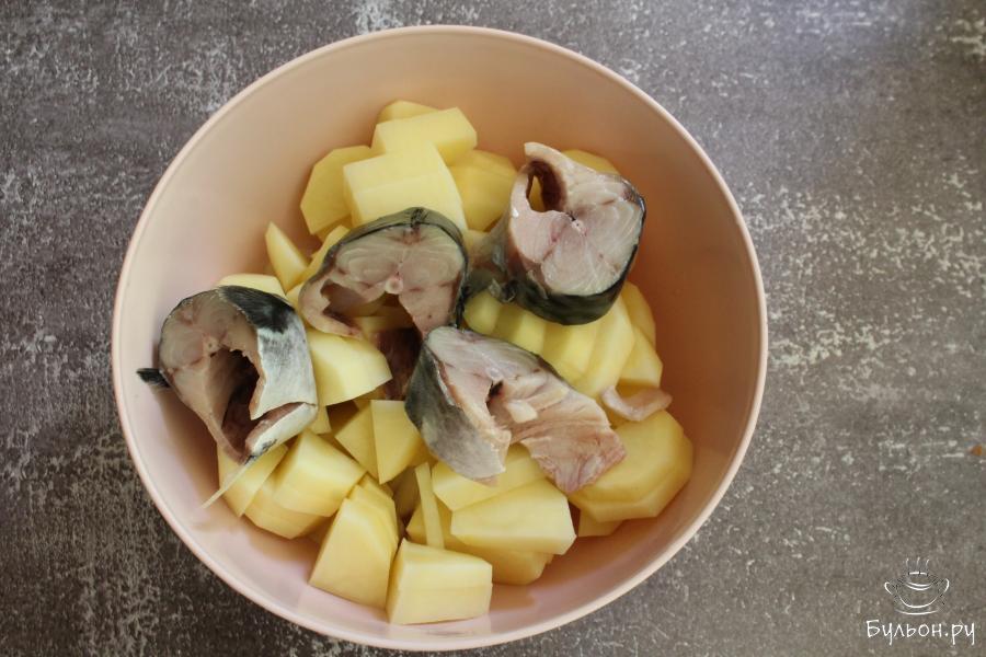 3. Скумбрию выпотрошить, убрать голову и хвост. Рыбу промыть и нарезать на широкие кусочки. Выложить рыбу к овощам.