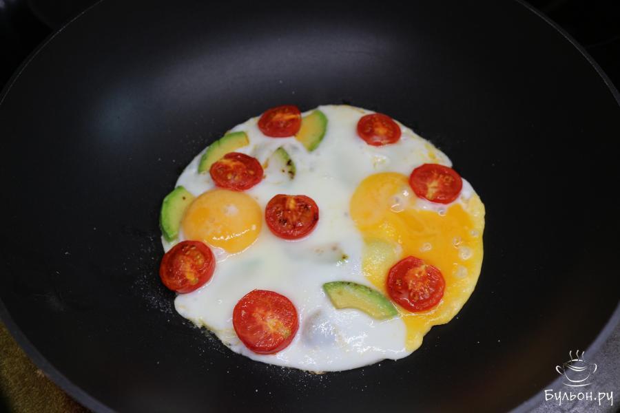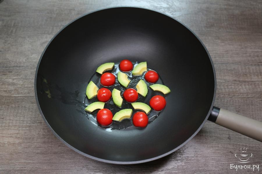 3. Растопите кусочек сливочного масла и выложите в сковороду помидоры и авокадо. Обжарьте их с одной стороны. Затем переверните на другую сторону.