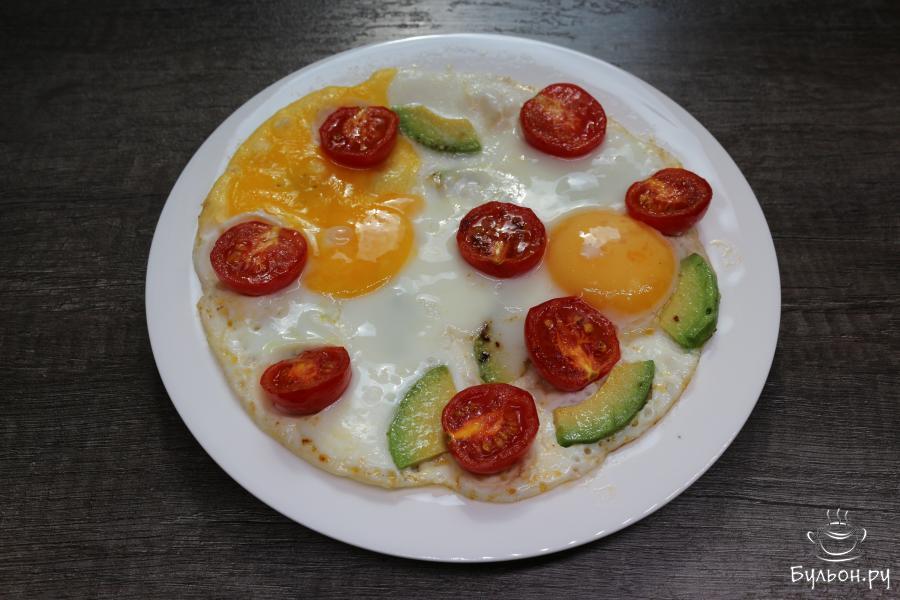 Завтрак для себя и своих близких - сделайте ярким, питательным, полезным, сытным. Для этого приготовьте не просто жаренную яичницу на сковороде, а яичницу с авокадо и помидорами. Таким образом, вы не только сделаете обычную яичницу более аппетитней, но еще и разнообразите обыденный завтрак. К яичнице советую подать чашечку кофе или какао. Также можно подать белый хлеб с маслом. Так тоже будет очень вкусно и получается сытнее. Помидоры черри используйте сочные и медовые, а авокадо берите спелое, в меру мягкое.