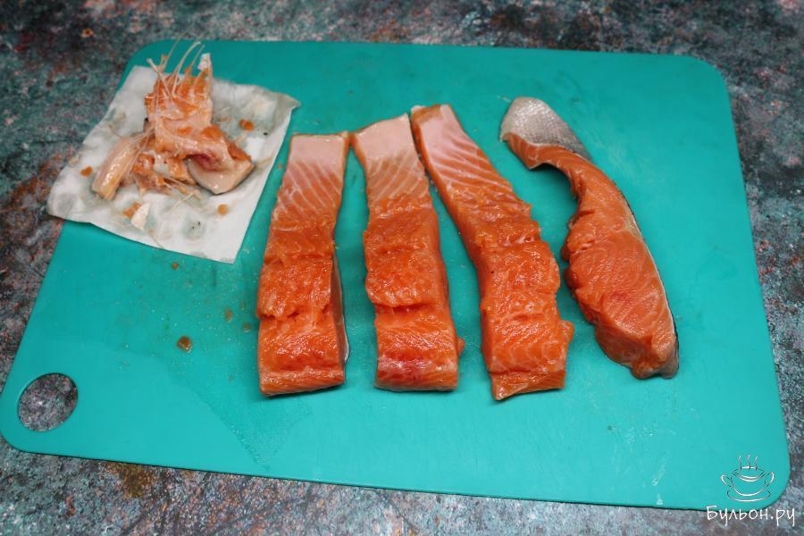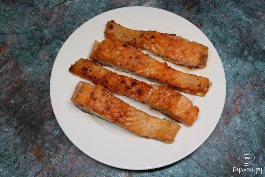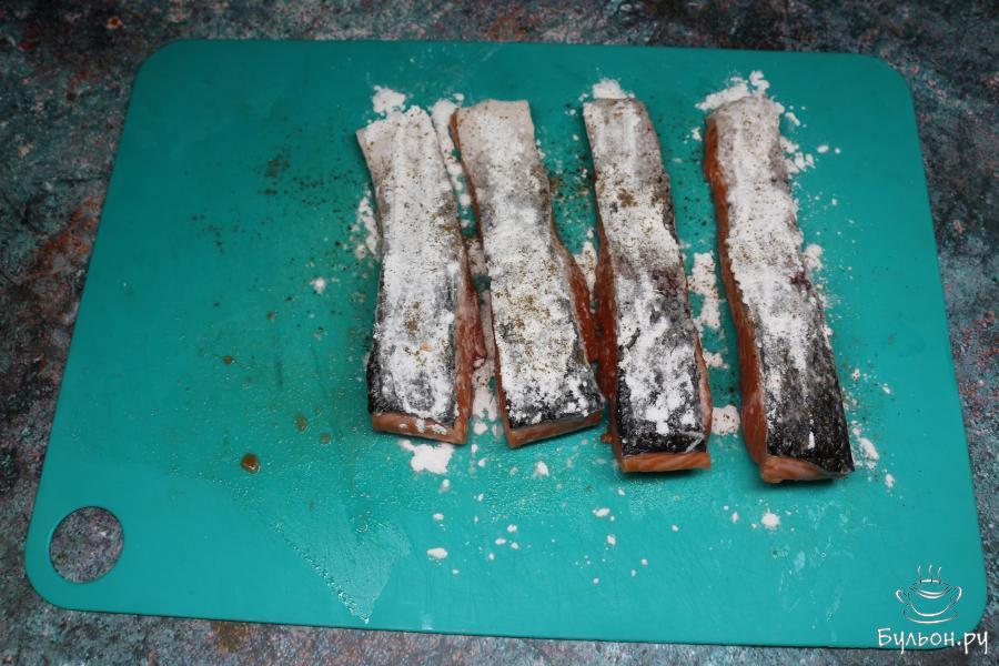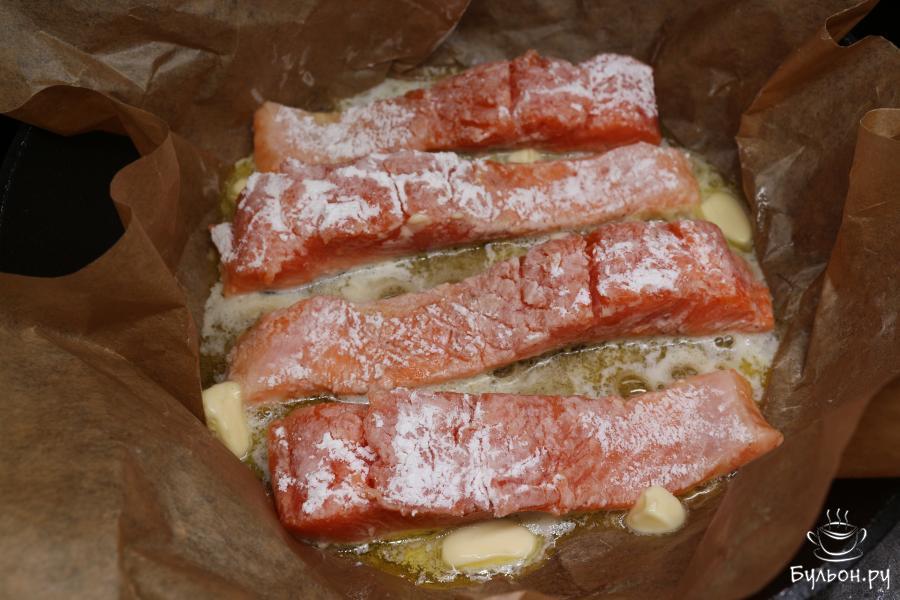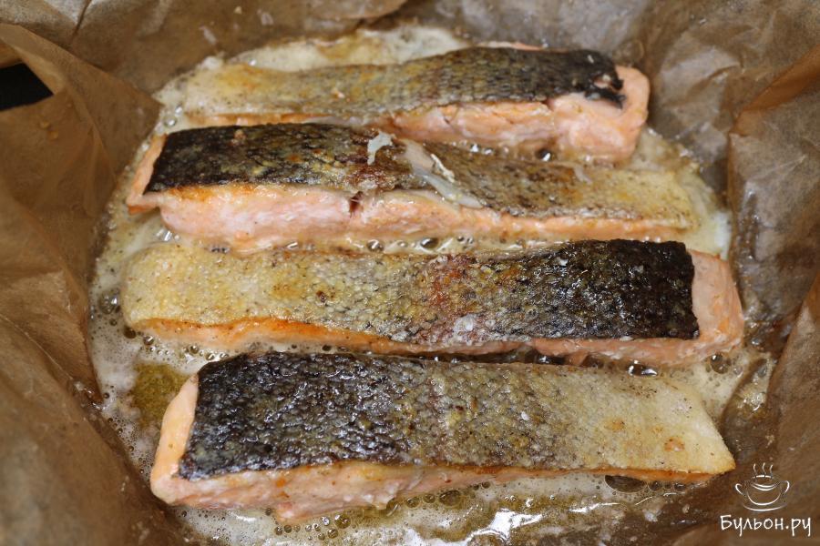 4. Выложите рыбу кожицей вниз, увеличьте огонь до среднего. Выложите кусочки сливочного масла между кусочков рыбы. Жарьте рыбу.