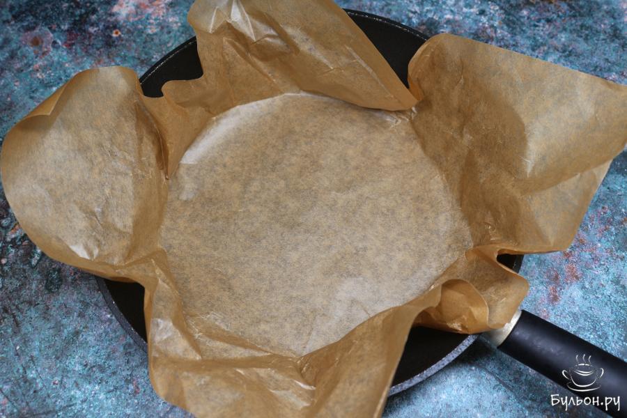 3. На сковороду выложите пергамент в один слой, чтобы он покрывал дно и бортики. Разогрейте сковороду с бумагой на слабом огне.
