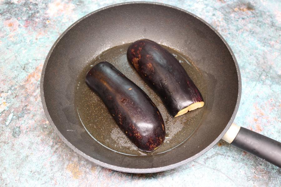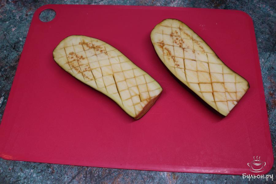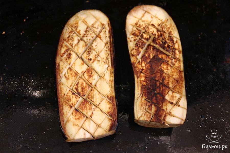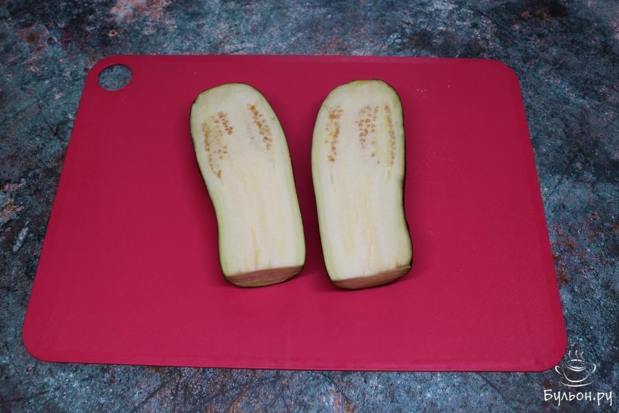 4. Выложите их на противень, подсолите и запекайте в духовке при 200 градусах 30 минут, мякоть баклажана станет мягкой.