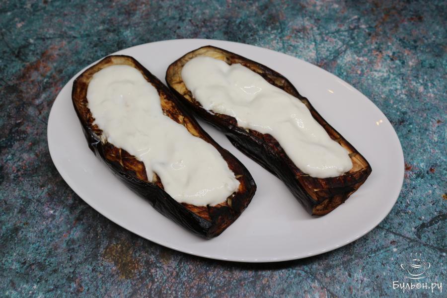 5. Смешайте сметану, соль и измельченный зубчик чеснока. Выложите по ложке сметанного соуса на каждую из половинок баклажана. Подайте к столу.