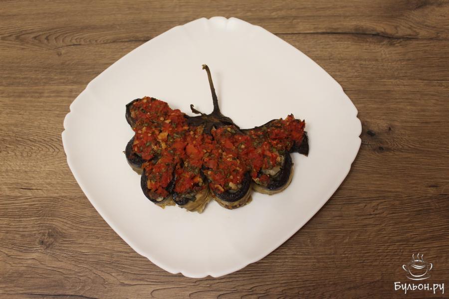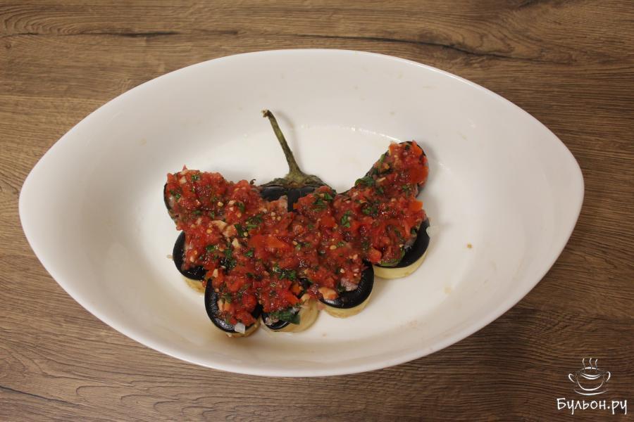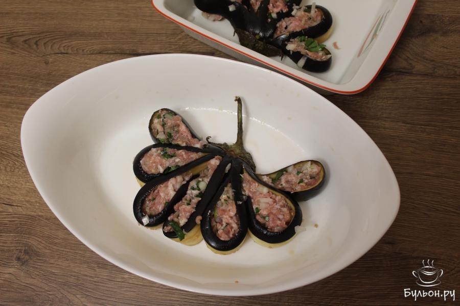 4. В форму для запекания, смазанную оливковым маслом, выложите баклажаны. Сформируйте цветки, подтягивая каждый лепесток к плодоножке. Крайние лепестки закрепите зубочистками. На каждый лепесток выложите фарш.