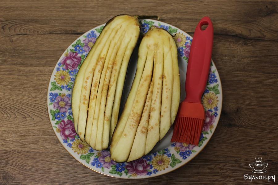 3. Подготовленные баклажаны промойте под водой, обсушите бумажными полотенцами. С помощью кондитерской кисточки каждый лепесток баклажана смажьте оливковым маслом.