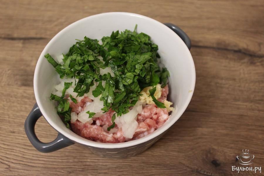 2. В емкость поместите фарш, добавьте измельченную луковицу, половину порубленной мелко зелени, пропущенный через пресс 1 чеснок, посолите и поперчите. Тщательно перемешайте и отбейте фарш.