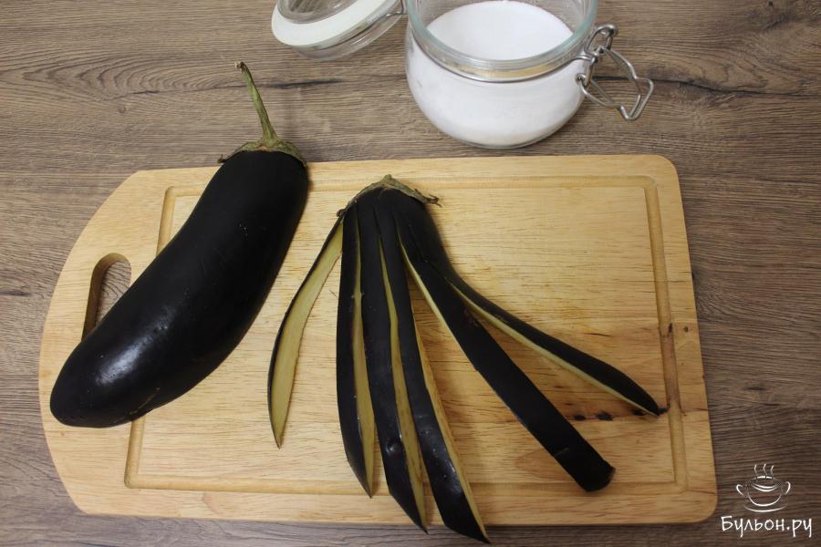 1. Возьмите баклажан покрупнее, чтобы легче было сделать лепестки. Баклажан промойте, разрежьте пополам, а затем, начиная от плодоножки, каждую половинку баклажана нарежьте длинными полосками. Каждый листик присыпьте солью и дайте настояться в течение 15 минут.