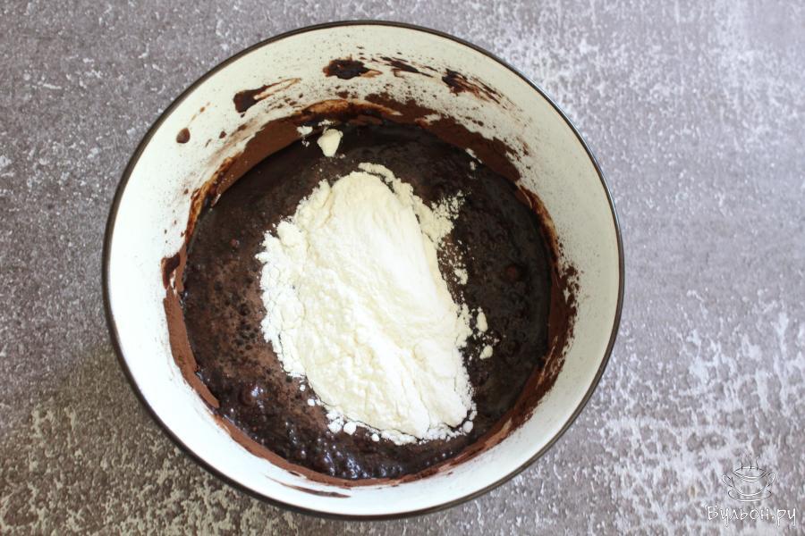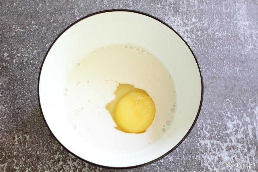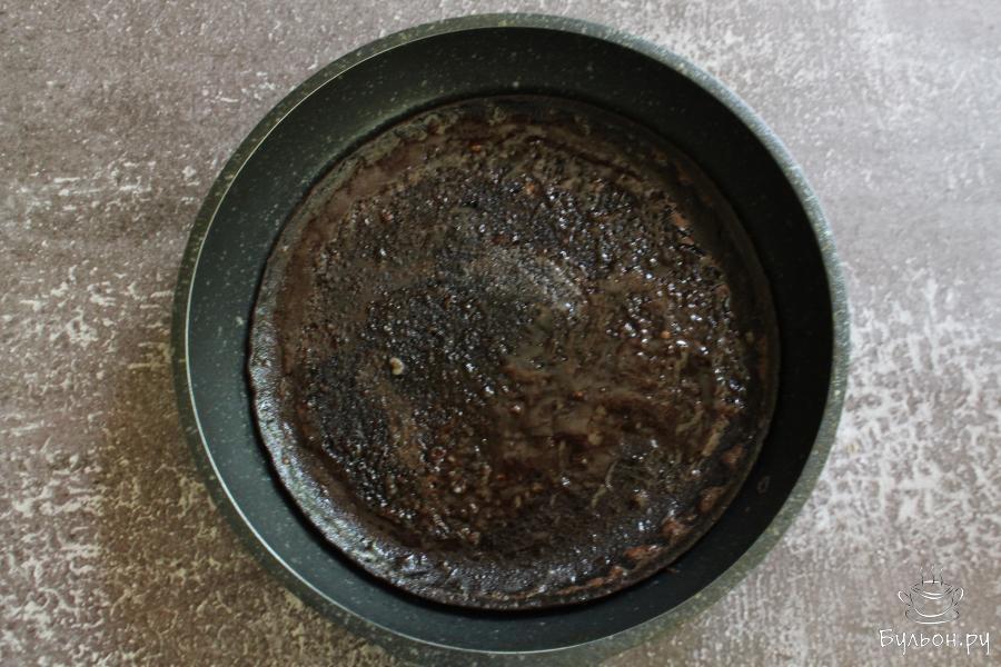 4. На сковороде растопить сливочное масло и вылить тесто. Жарить блин на небольшом огне, под крышкой, с одной стороны.