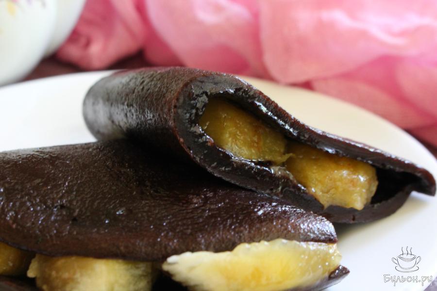 Шоколадный блин с бананами отлично подойдет для завтрака, полдника или просто к чаю. Блин получается достаточно большой и его можно разделить на две порции. Блин получается вкусный, сладкий, нежный. Если бананы попались твердые и пресные, то для начинки их нужно нарезать кружочками и обжарить до мягкости на сковороде со сливочным маслом и сахаром. Если яйцо мелкое, то можно добавить два яйца в тесто.