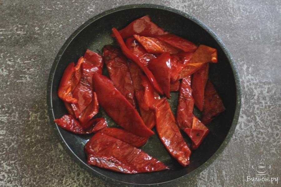 1. Перцы почистить от семечек, промыть, обсушить, крупно нарезать. Обжарить перцы на сковороде с разогретым маслом, на сильном огне, 6-7 минут, помешивать. Выложить перцы в чашку.