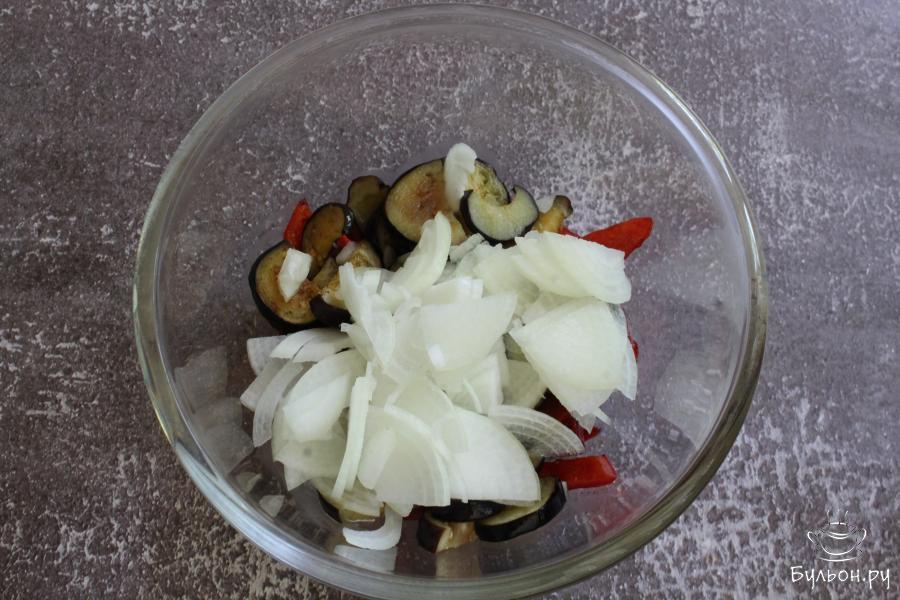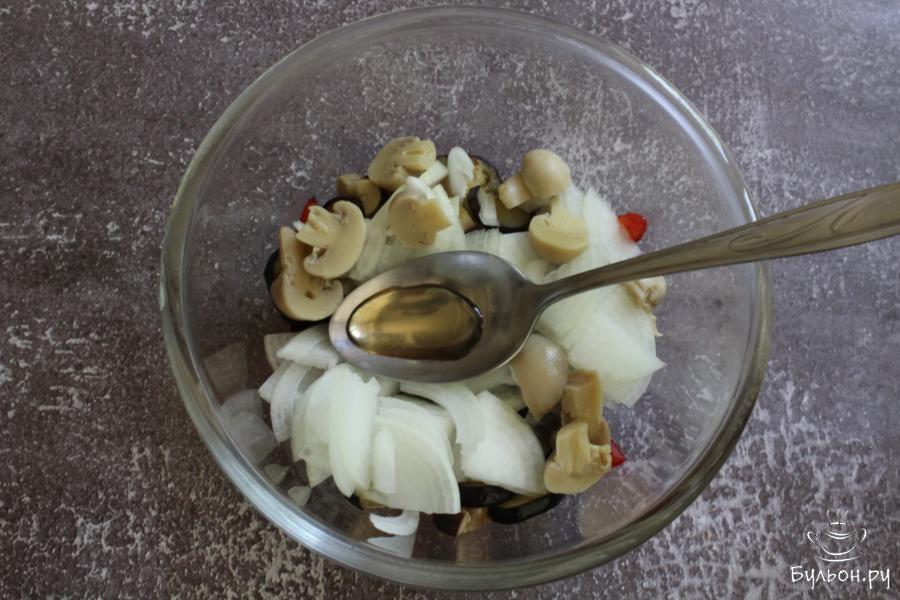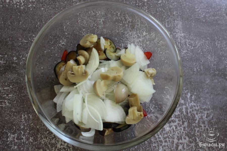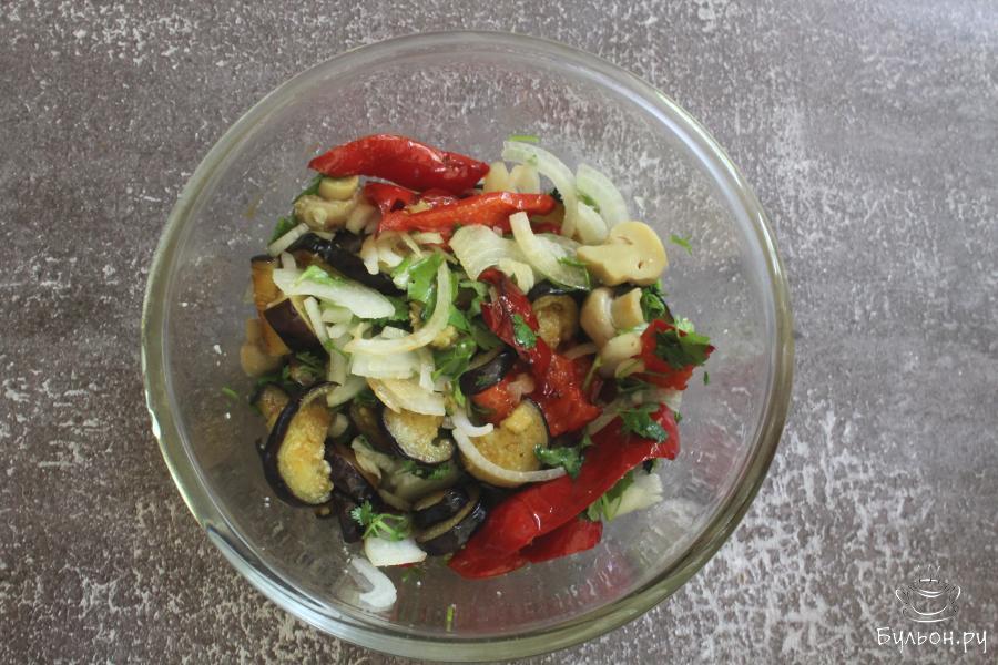 Салат из жареных баклажанов и перцев с шампиньонами понравится многим, он получается яркий, сочный, вкусный, полезный и душистый. Если вы любите жареные баклажаны и перцы, обязательно приготовьте и такой салат тоже. Готовится салат быстро и очень просто. Перцы для приготовления нужны обязательно красные, они более сладкие и мясистые. Зелень для салата выбирайте свою любимую. Уксус можно заменить на лимонный сок.