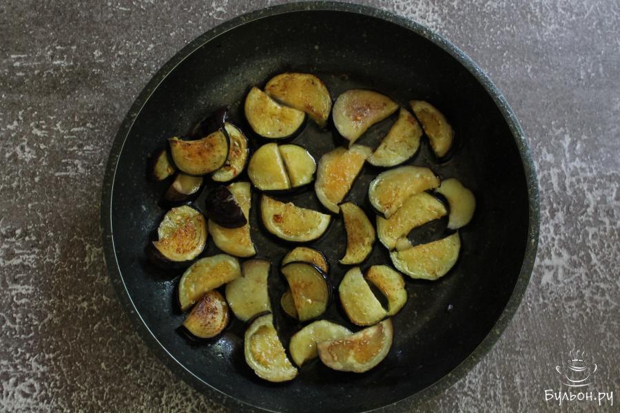 2. Баклажаны промыть, обсушить, нарезать кружочками и обжарить на сковороде после перцев. Жарить баклажаны с двух сторон до румяного цвета.