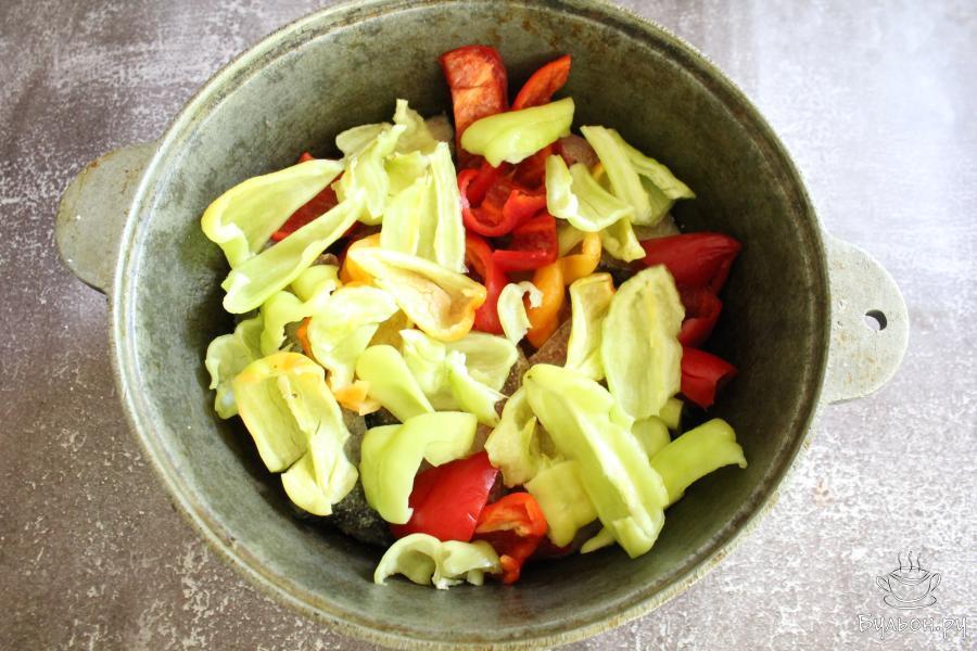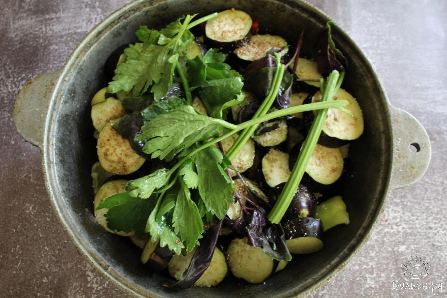7. Влить воду в казан. Ветки сельдерея выложить целиком, посолить, поперчить и посыпать кориандром. Накрыть казан крышкой и готовить блюдо 35-40 минут.