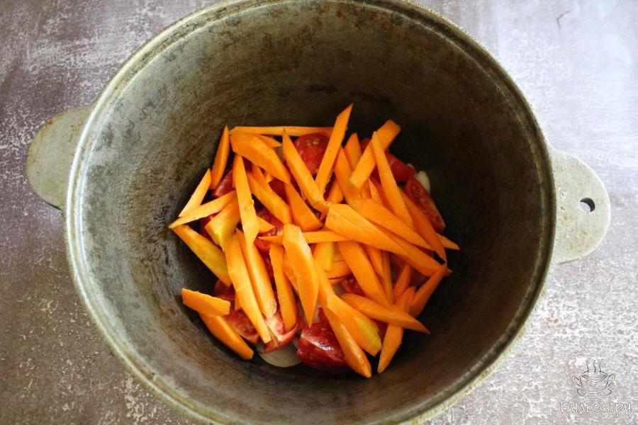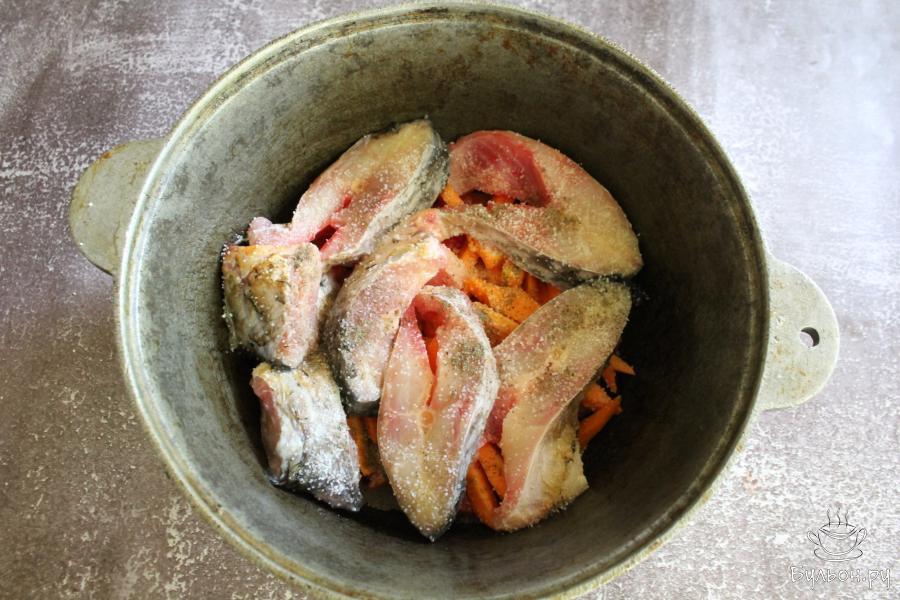 4. Свежего карпа (сазана) нарезать на крупные куски и выложить поверх моркови, посолить и поперчить по вкусу.