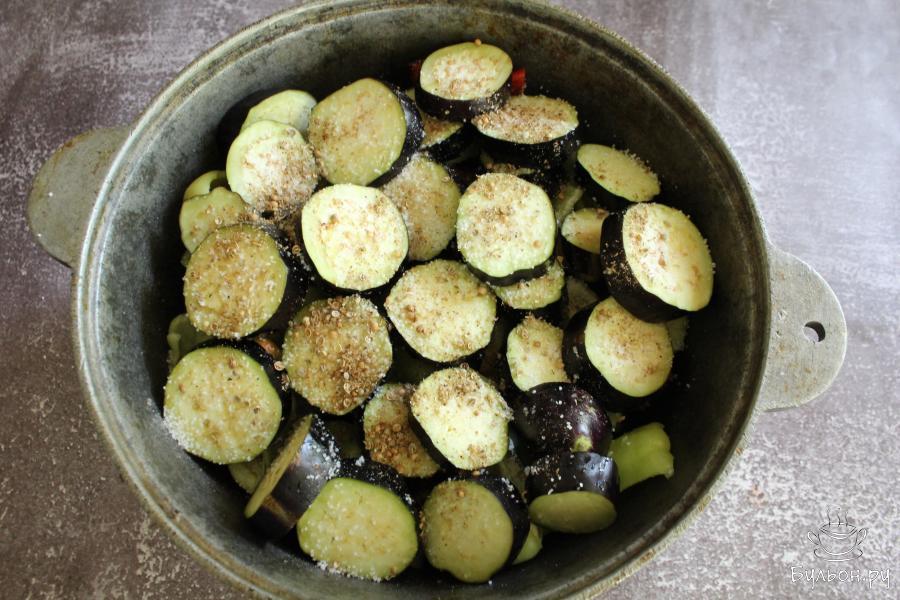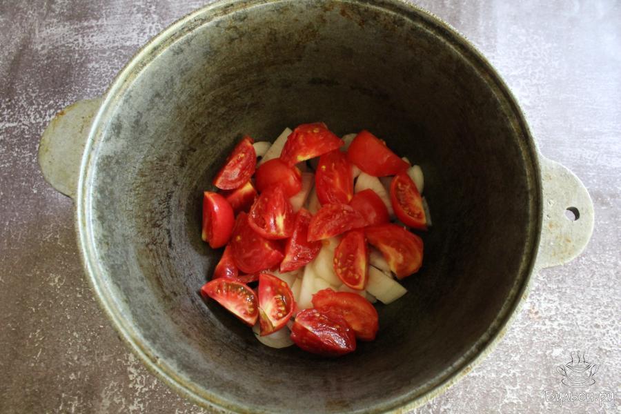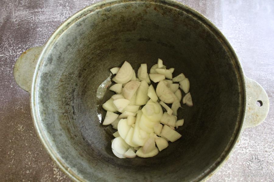 1. Овощи почистить и промыть. Баклажаны и помидоры не чистить. Лук нарезать крупно и выложить в казан, налить масло.