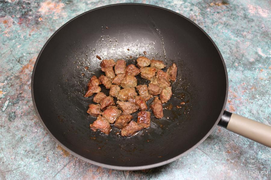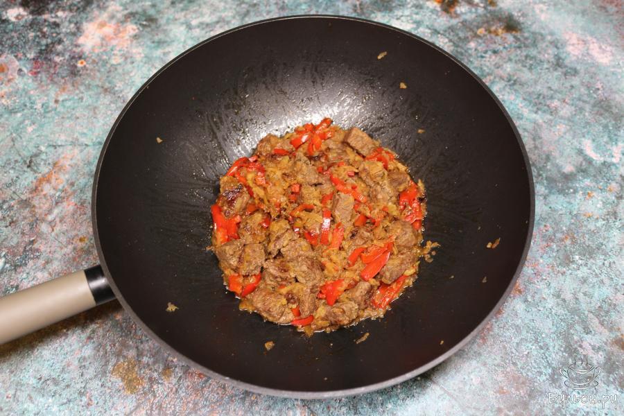 5. В слегка обжаренную печень добавьте перец и яблоко, также соль и черный молотый перец, перемешайте.