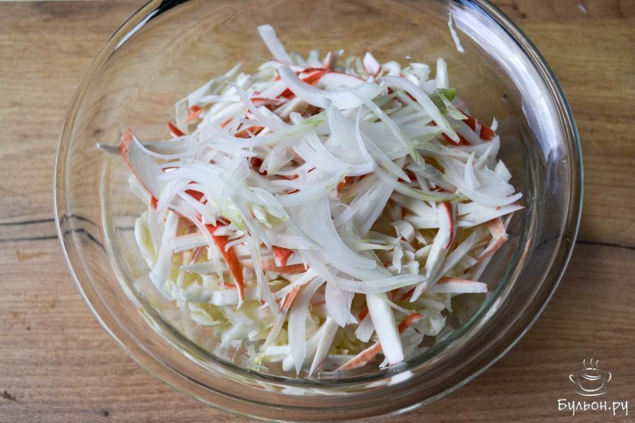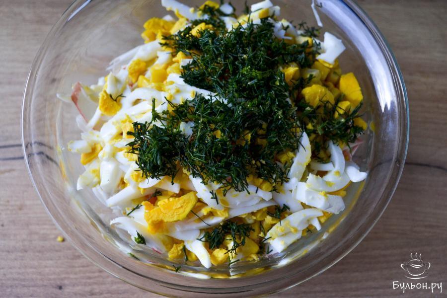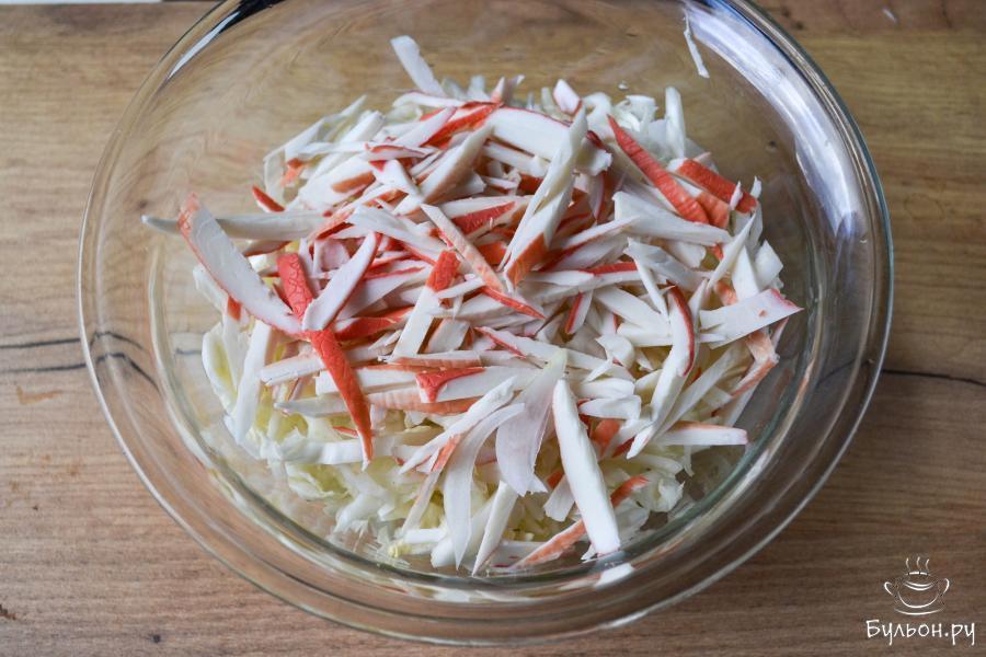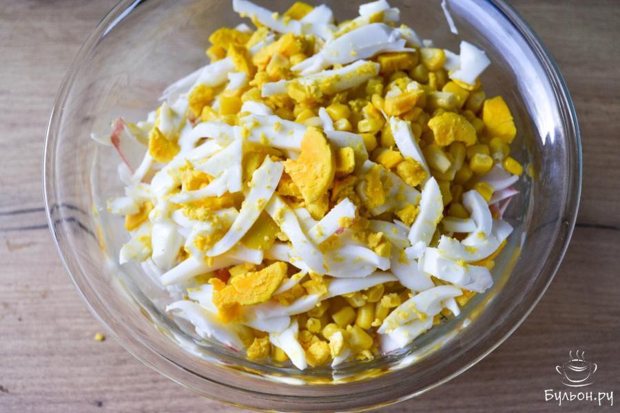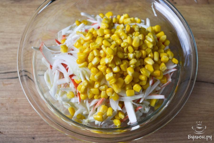 Салатик из капусты, кукурузы, крабовых палочек и вареных яиц, можно приготовить за считанные минуты. Пока варятся и охлаждаются яйца, можно нашинковать капусту, нарезать лук и крабовые палочки. Затем добавить охлажденные, нарезанные яйца, консервированную кукурузу, соль, перец и майонез по вкусу. Капусту можно взять белокочанную или пекинскую. Из пекинской капусты салат получится более нежным, ведь листья "пекинки" тоньше и мягче, чем у белокочанной. Если будете готовить из белокочанной, то нарезанную соломку капусты немного помните руками, чтобы она стала чуть мягче и пустила сок.