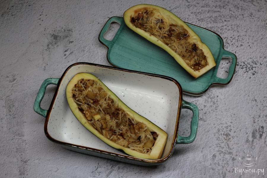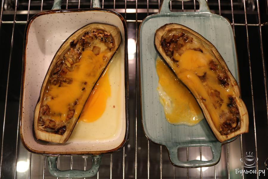 4. Половинки баклажан начините подготовленной начинкой, утрамбовав ее. Запекайте баклажаны при 180 градусах в течение 20 минут.