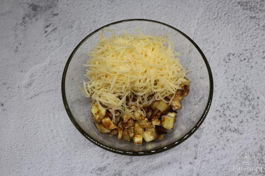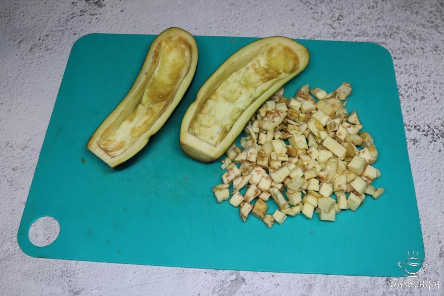 1. У баклажана отрежьте плодоножку, разрежьте его вдоль пополам. Из каждой половинки извлеките аккуратно мякоть баклажана, нарежьте небольшими кубиками.