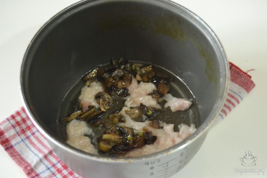 2. Грибочки (шампиньоны) нарезать и обжарить в мультиварке вместе с куриным филе на подсолнечном масле. Жарим на программе "Жарка" (118-122 градуса) минут 15. Посолить и поперчить, время от времени помешивать.