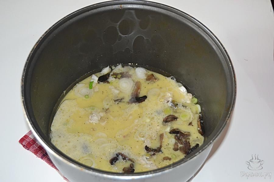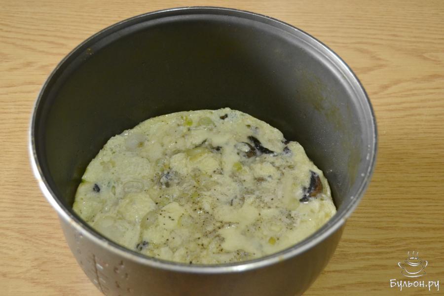 4. Добавить к поджаренным грибочкам и филе. Я готовлю омлет на программе "Пароварка" (115-120 градусов), устанавливаю ее на 15 минут. Я все же посматриваю на состояние своего омлета, иногда времени на готовку нужно больше или меньше.
