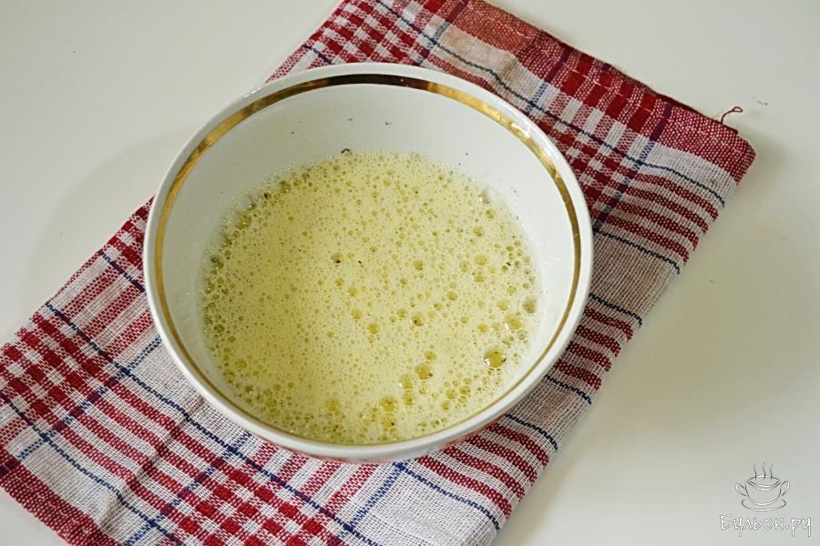 3. А пока филейка и грибочки жарятся, подготовим яичную массу. Сегодня омлет я буду готовить на воде. Соединить яйца с водой, взбить, перемешать с солью и перцем.