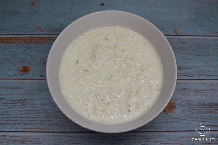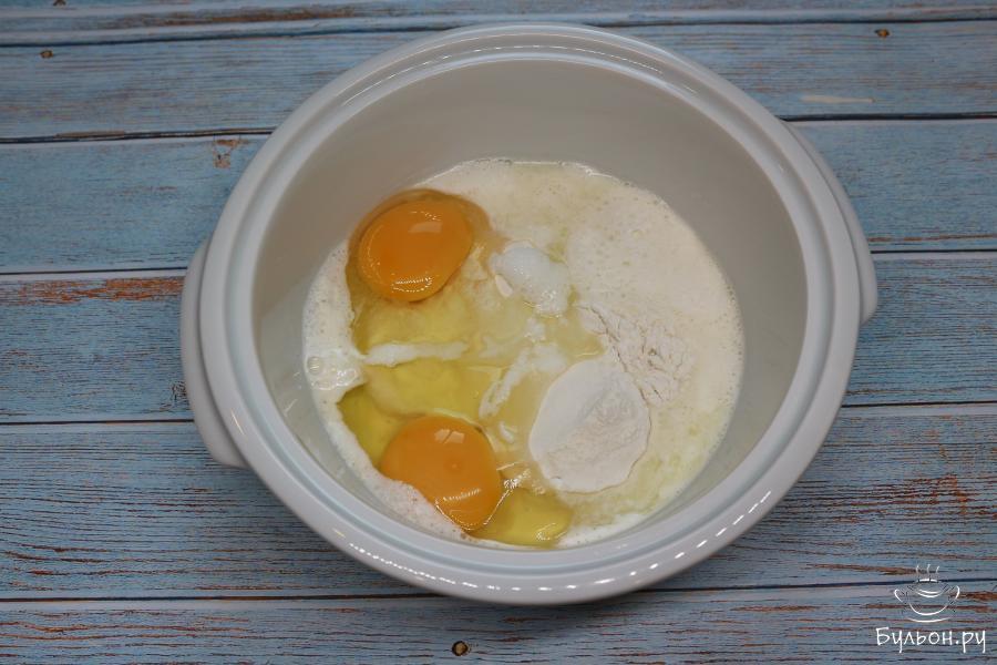 2. В емкость вбейте яйцо, влейте молоко, всыпьте муку, разрыхлитель и щепотку соли. Взбейте венчиком все ингредиенты до состояния однородности.