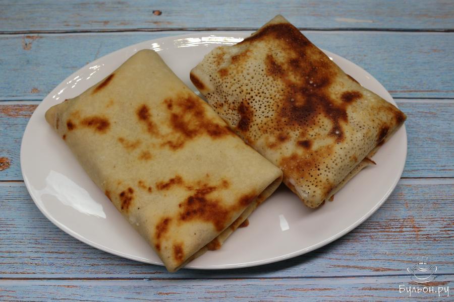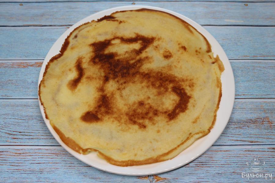4. Теперь испеките блины. Для обжарки первого блина положите кусочек сливочного масла на сковороду, растопите его. Влейте тесто, распределив его равномерно по всей поверхности сковороды. Обжарьте блин с двух сторон до золотистого цвета. Испеките следующий блинчик.