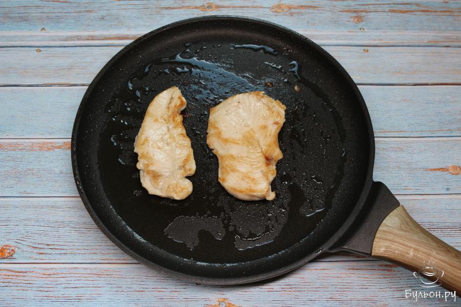 3. Куриную грудку разрежьте вдоль пополам. Обжарьте куриное филе на сковороде в небольшом количестве растительного масла, с двух сторон. В конце подсолите курицу. Куриное филе разрежьте на продолговатые кусочки.